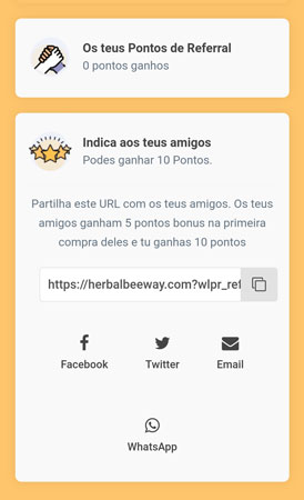 Para seres Embaixador, tens que te tornar um Membro Herbalbeeway e fazer o Registo na tua área de utilizador, ou usar o Botão "Junta-te a Nós". Para acumular pontos, é preciso partilhar o nosso link de Embaixador Afiliado, que se encontra disponível na zona de utilizador no Menu de Pontos, ou no Telemóvel através do botão do lado esquerdo, carregar e fazer partilha do Link ou Copias o Link e partilhar.