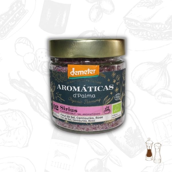 Flor de Sal Aromatizada Biológica para Saladas – Sirius, mistura á base de Flor de Sal, Centáurea e Rosa, selecionada especialmente para saladas.